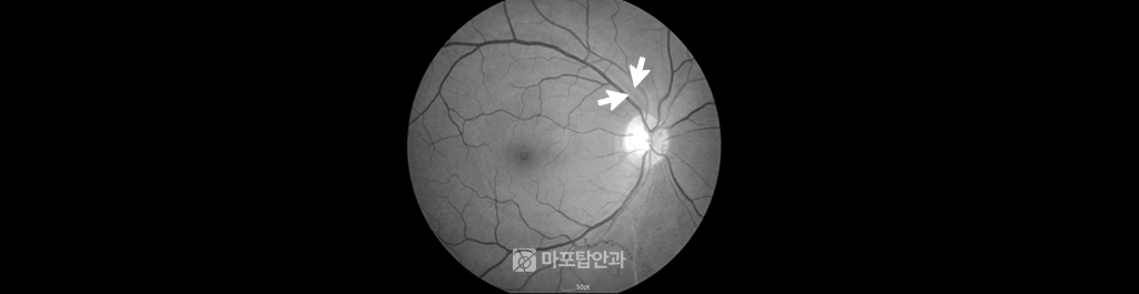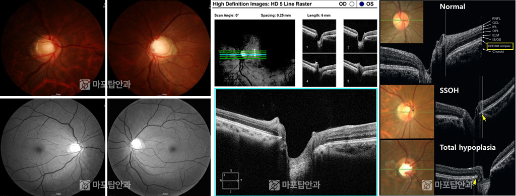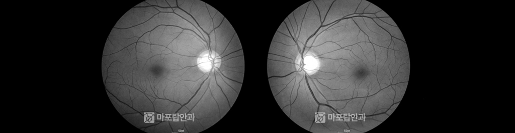 라식 예정이었던 34세 여자 환자의 안저 검진 사진입니다. 좌측 녹내장 의증으로 의뢰되었지만 시야 검사를 비롯한 정밀검사와 논문게재 방법을 이용하여 SSOH(시신경 부분 형성 부전) 정상 진단으로 판정했습니다. 진단 후 7년동안 시신경 섬유의 변화가 없었으며 라식 수술을 진행한 케이스입니다.