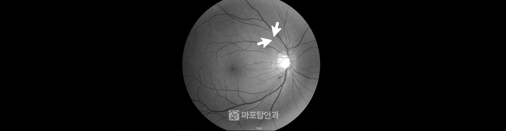 40세 남자환자의 안저 검진 사진입니다. 건강 검진상으로는 정상이었으나 상이측 시신경섬유결손과 시야손상 발견되어 초기 녹내장 진단 받고 치료 중입니다.
